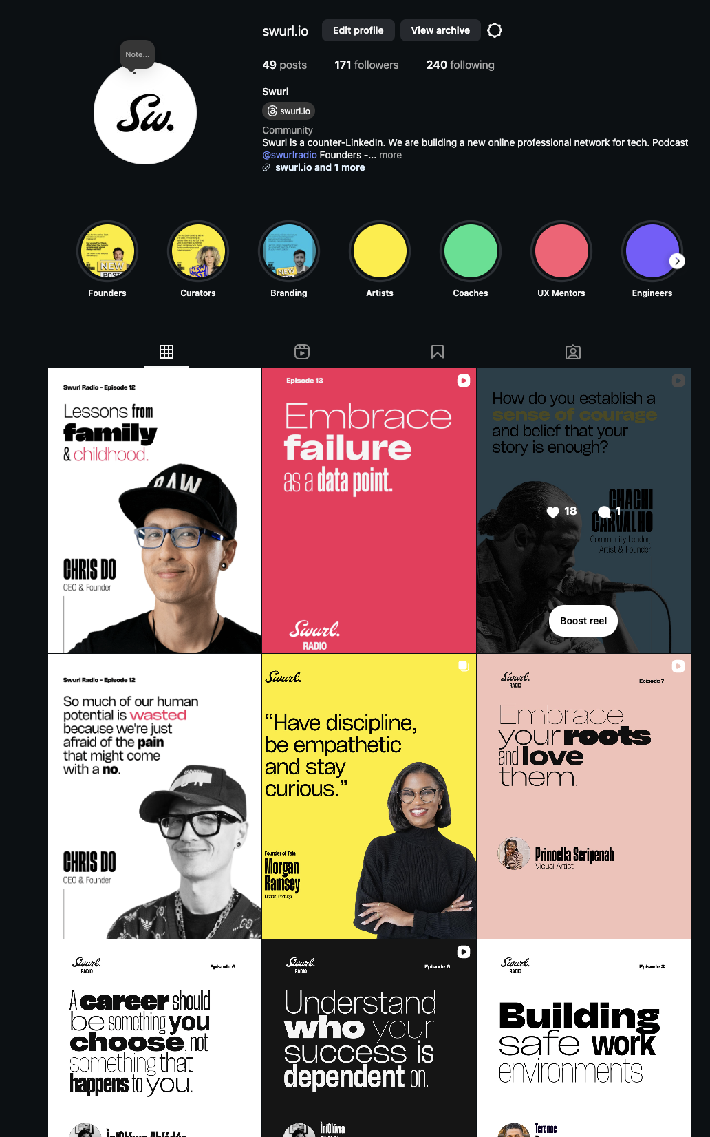 Beyond Kickstarter, I launched Swurl Radio, a weekly podcast featuring conversations with creative professionals, coaches, and entrepreneurs. The podcast served as both community-building and ongoing user research — every episode gave me new insight into what our target audience was struggling with and what they needed from the platform.